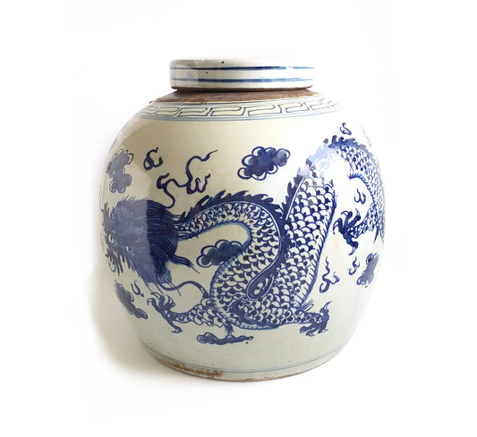 Blue & White Chinoiserie Handpainted Dragon Ginger Jar