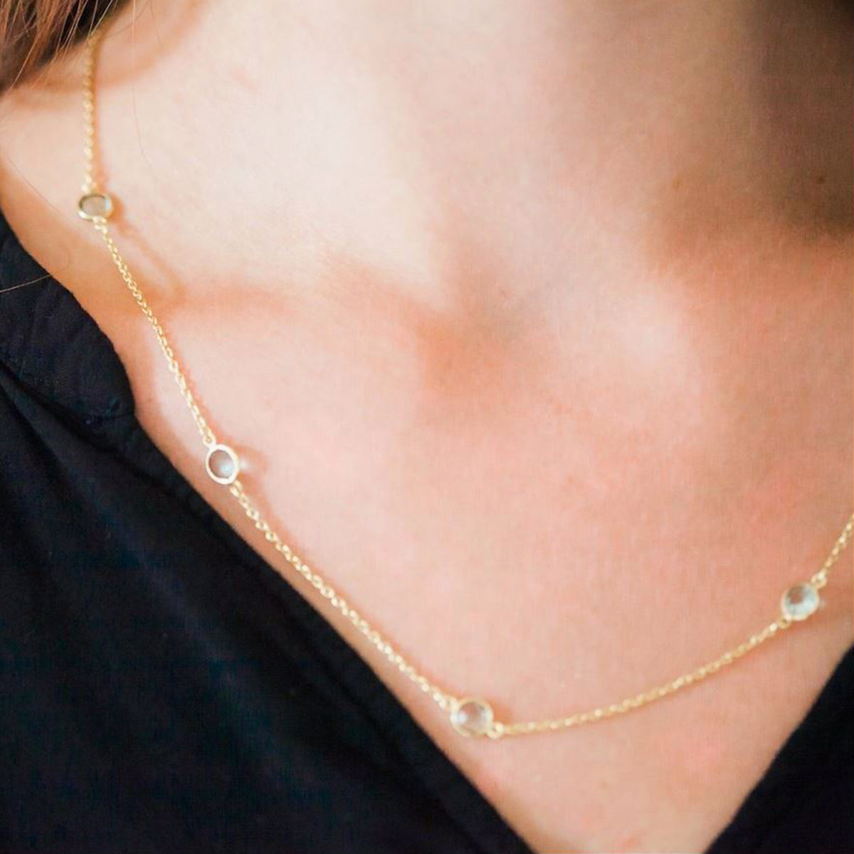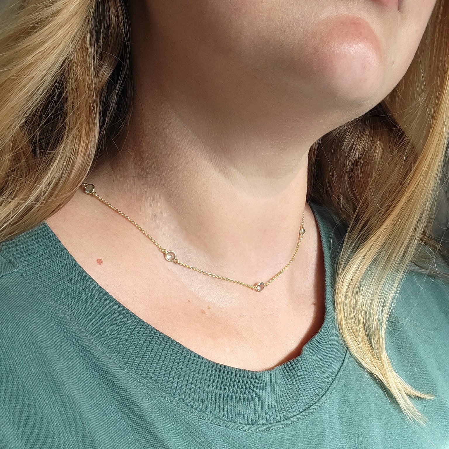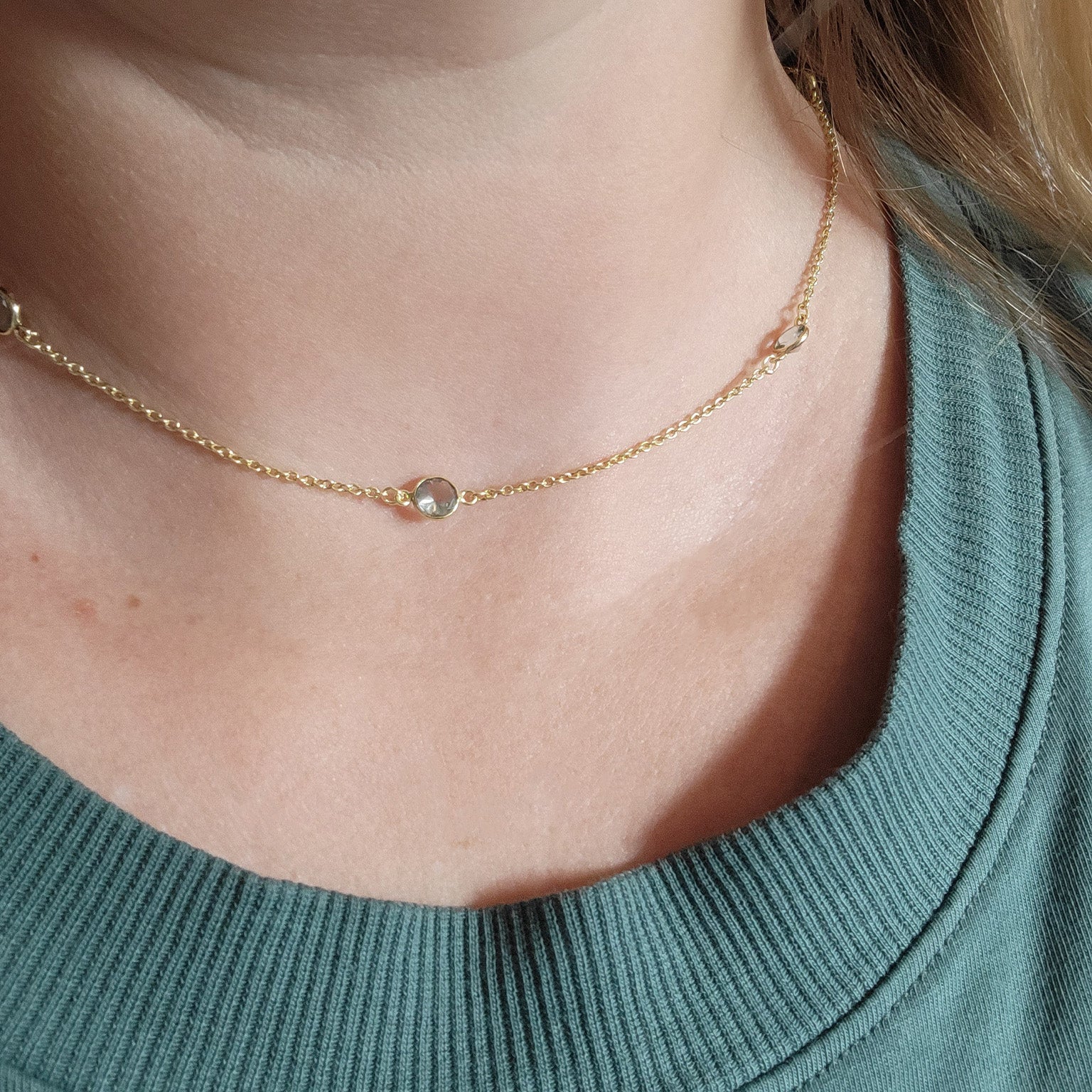 A simple and timeless piece, the dainty Unity Necklace features hand-cut prasiolite (green amethyst quartz) gemstones set in 14kt gold plated brass settings and chain. Each stone has been hand-selected for its delicate green hue and masterfully cut with traditional techniques.