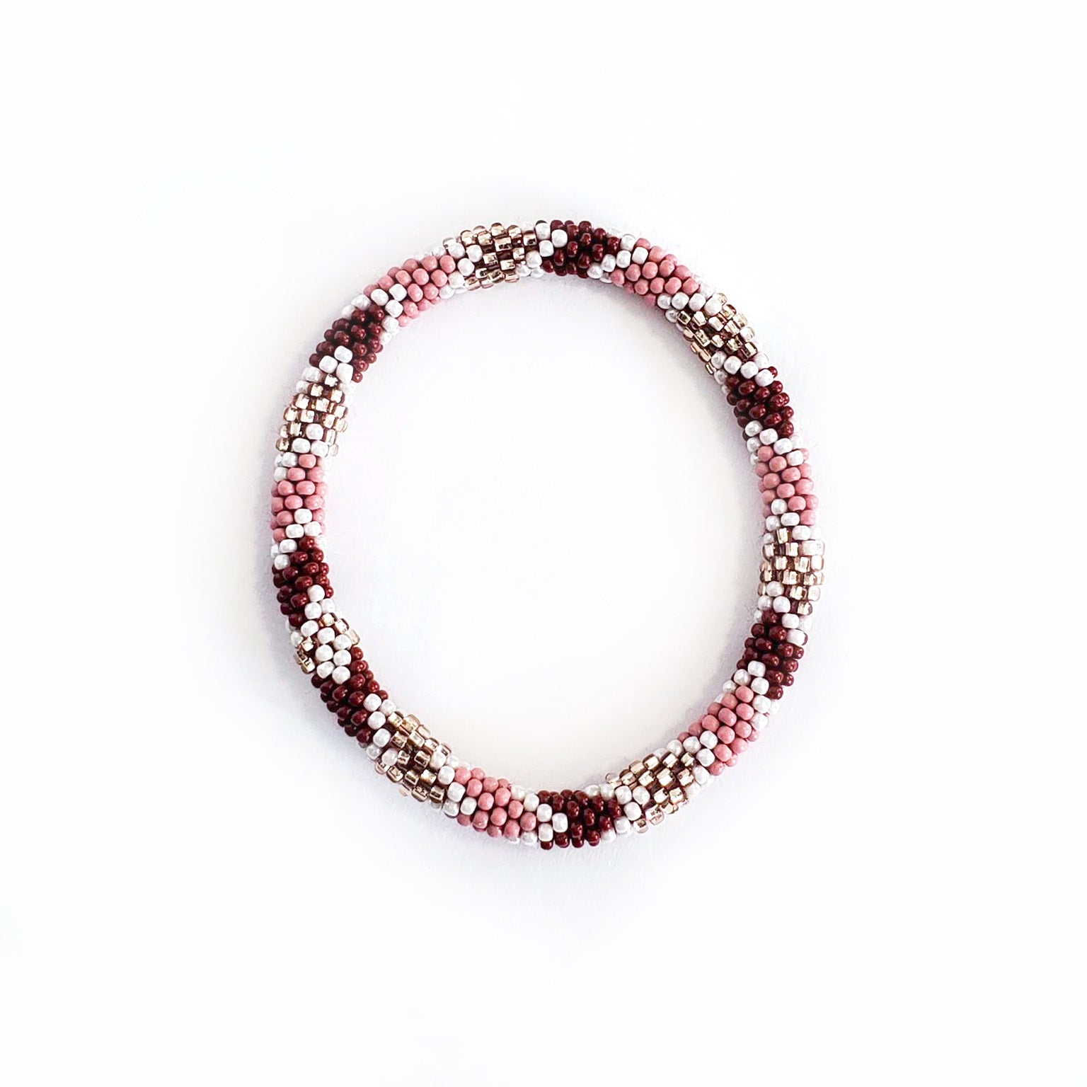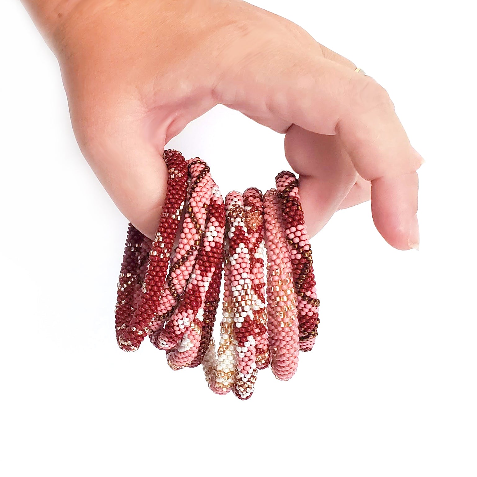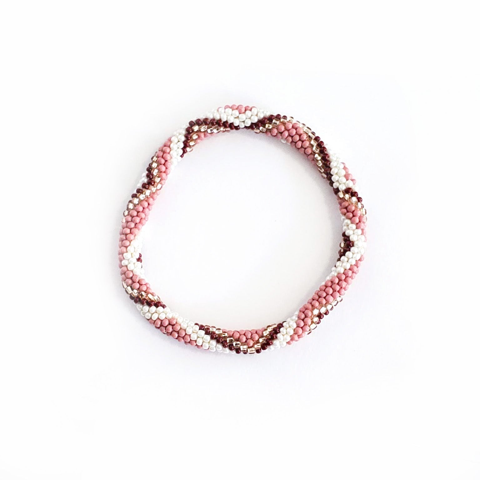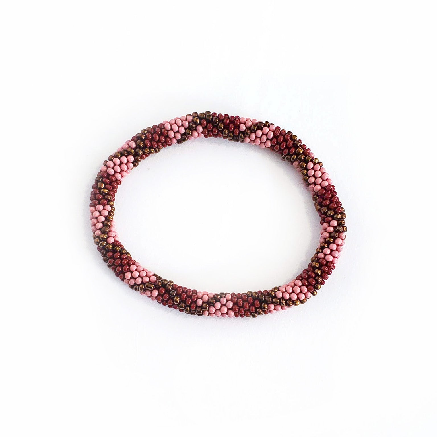 Perfectly colored for a fall day, with soft millennial rose pink, gold, rich bronze, and deep wine red shades, the lovely Desert Rose set is an assortment of stack-able, mix-and-match roll-on bracelets for easy every day wear. Plus, they're ethical and 100% fair trade!