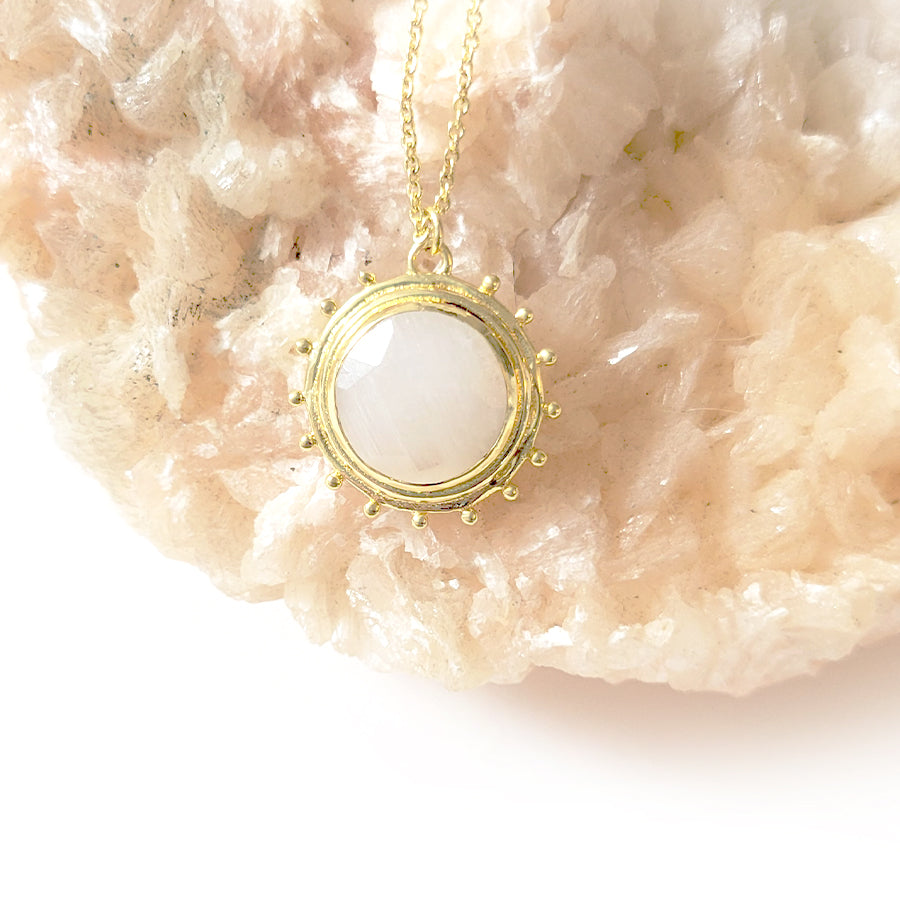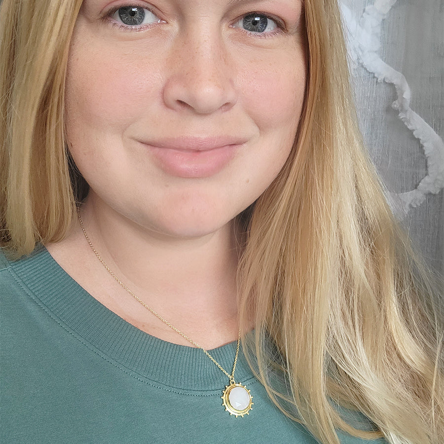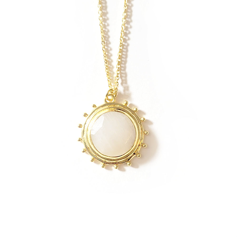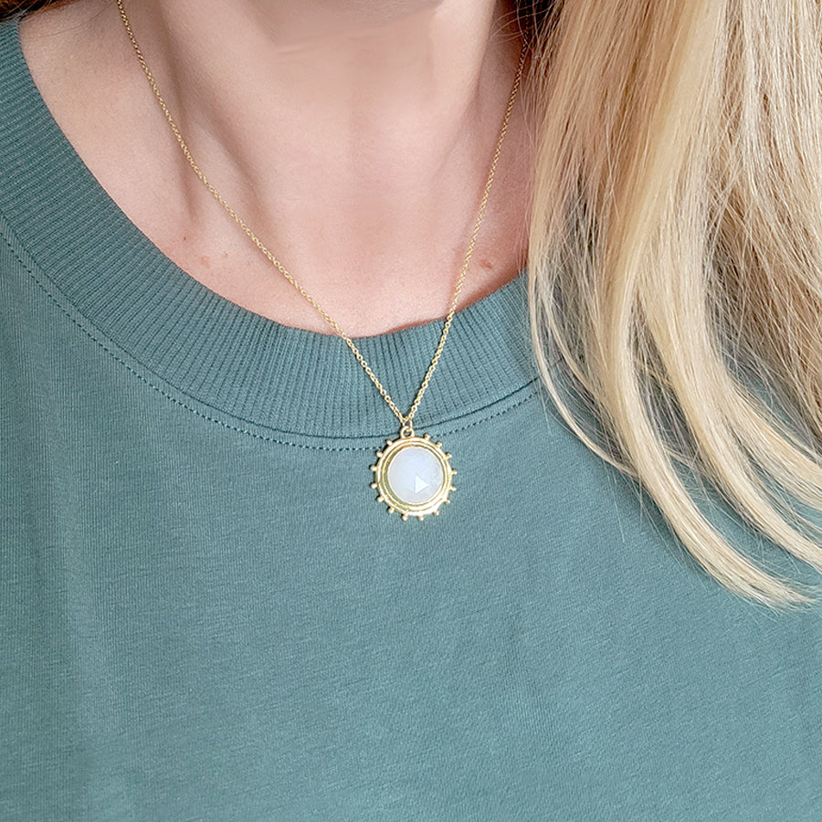 Delicate and delightful, the sunshine-shaped Catalina Necklace sits on a dainty gold-tone chain. A classic gal, in disposition and style, Catalina comes with a luminous hand-cut Moonstone gem.
