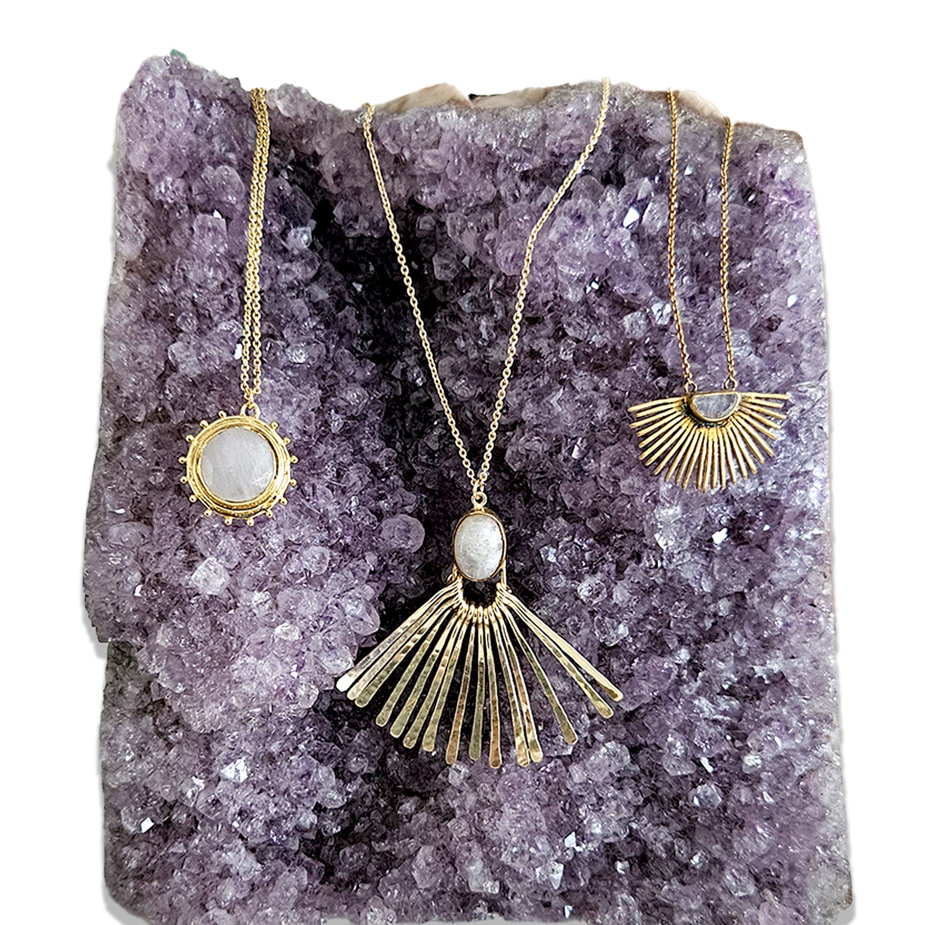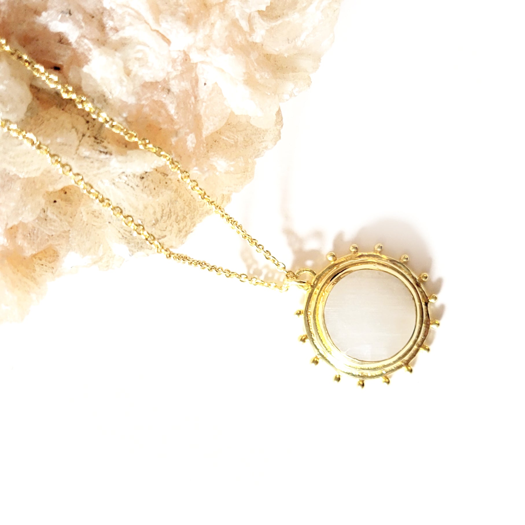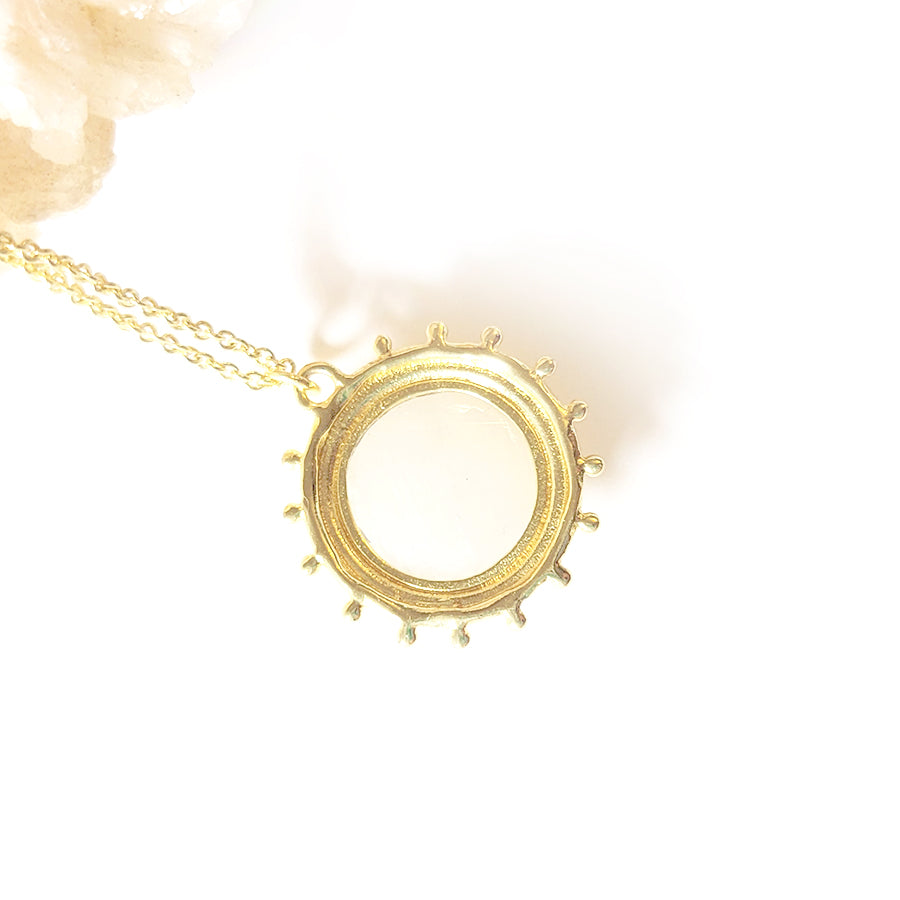 Delicate and delightful, the sunshine-shaped Catalina Necklace sits on a dainty gold-tone chain. A classic gal, in disposition and style, Catalina comes with a luminous hand-cut Moonstone gem.