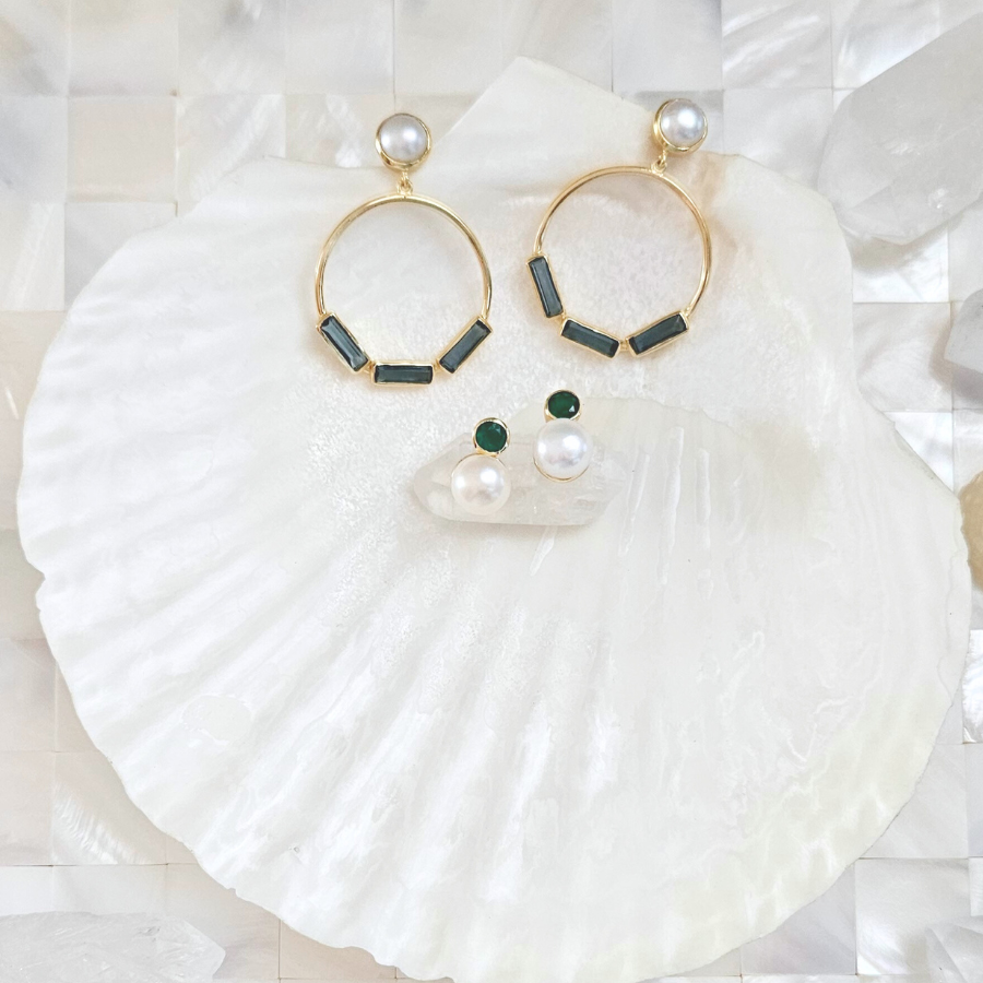 Fun-seeking Claudia earrings are unique, social and fabulous! Claudia is one who is funny and beautiful in a unique way and seems super confident, as shown by the large scale of these statement piece sparkling with violet-blue Blue Iolite hoops on pearl studs. The combination of Iolite and pearl makes for a wise, sincere, journey-seeking person.