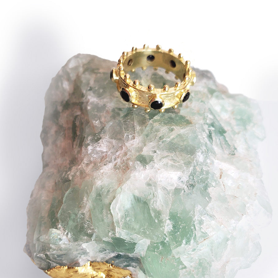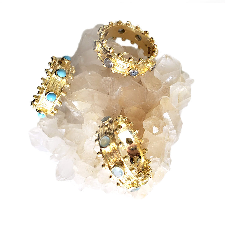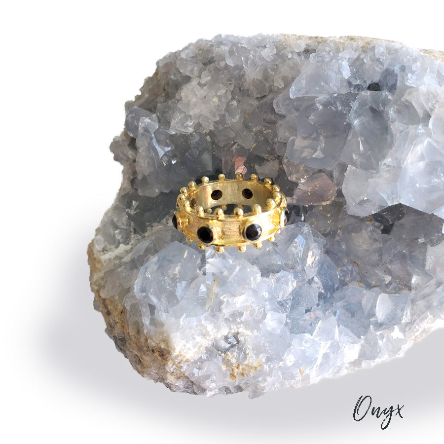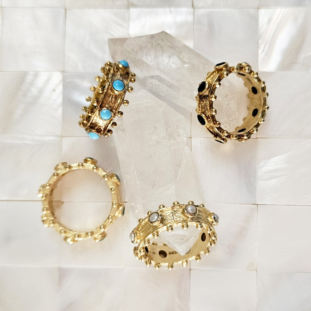 The delightfully chunky, stackable statement Etruscan ring is a testament to lost art forms of the fables ancient Etruria civilization from ancient Italy. Long revered for their incredible art and design or jewels and regalia, the Etruscans were a huge influence on the Greece and Roman art renaissance. Redesigned for modern use, and brought to life with the skill of ethical artisans in India, this delightfully thick, textured and detailed statement ring comes in a variety of lovely hand-cut gemstones to choose from.
