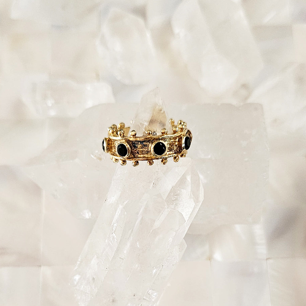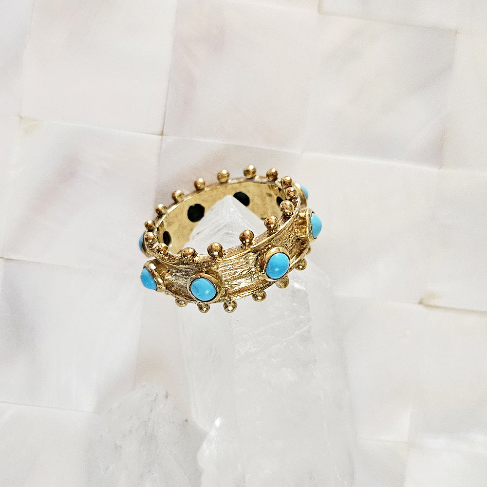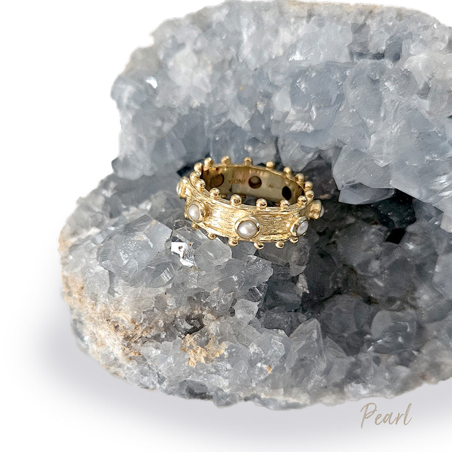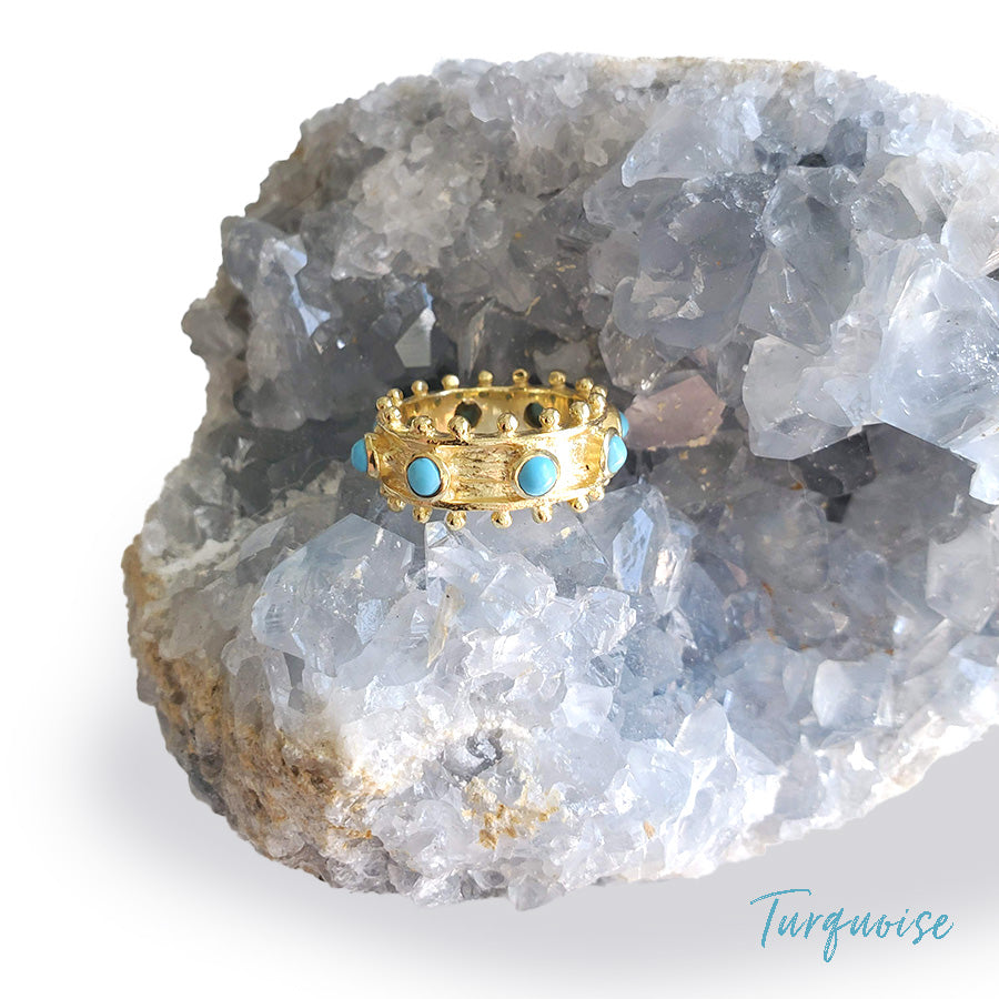 The delightfully chunky, stackable statement Etruscan ring is a testament to lost art forms of the fables ancient Etruria civilization from ancient Italy. Long revered for their incredible art and design or jewels and regalia, the Etruscans were a huge influence on the Greece and Roman art renaissance. Redesigned for modern use, and brought to life with the skill of ethical artisans in India, this delightfully thick, textured and detailed statement ring comes in a variety of lovely hand-cut gemstones to choose from.