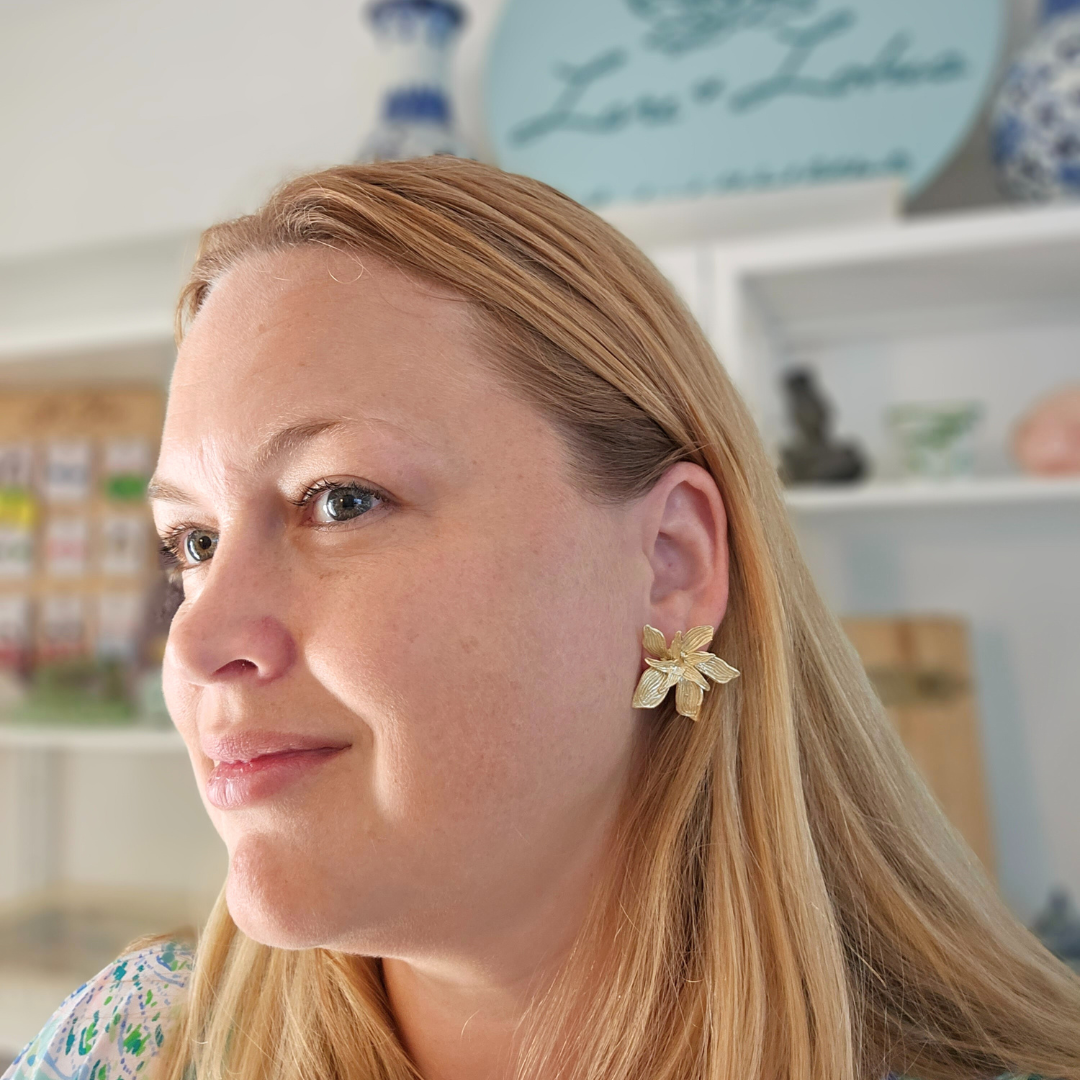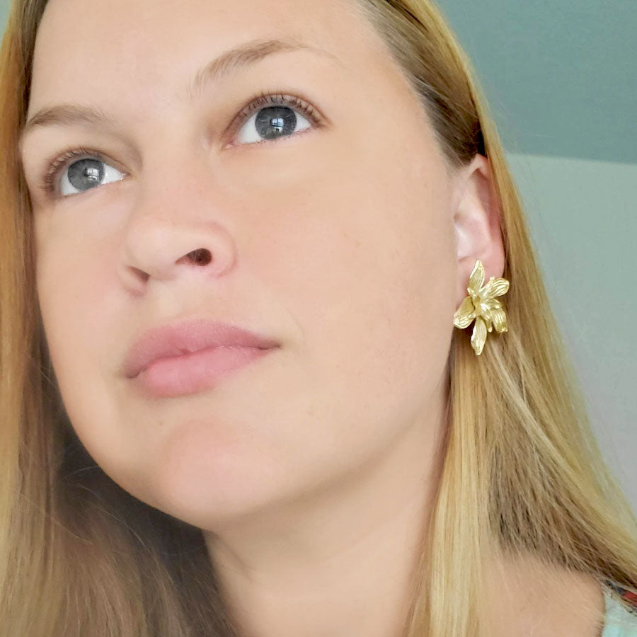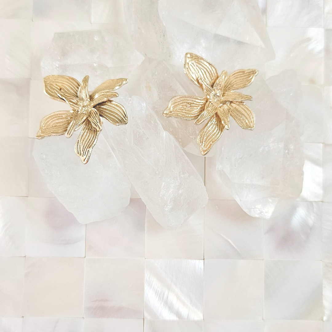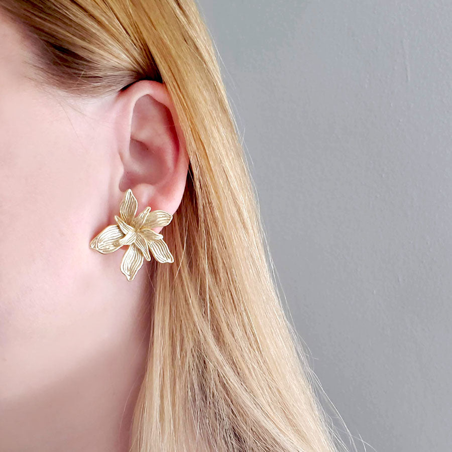A truly statement piece, these breath-taking over-sized orchid blooms of the Penelope earrings are sure to catch admiring eyes. Incredibly detailed and lovingly furled, the orchid design delicate and desirable.