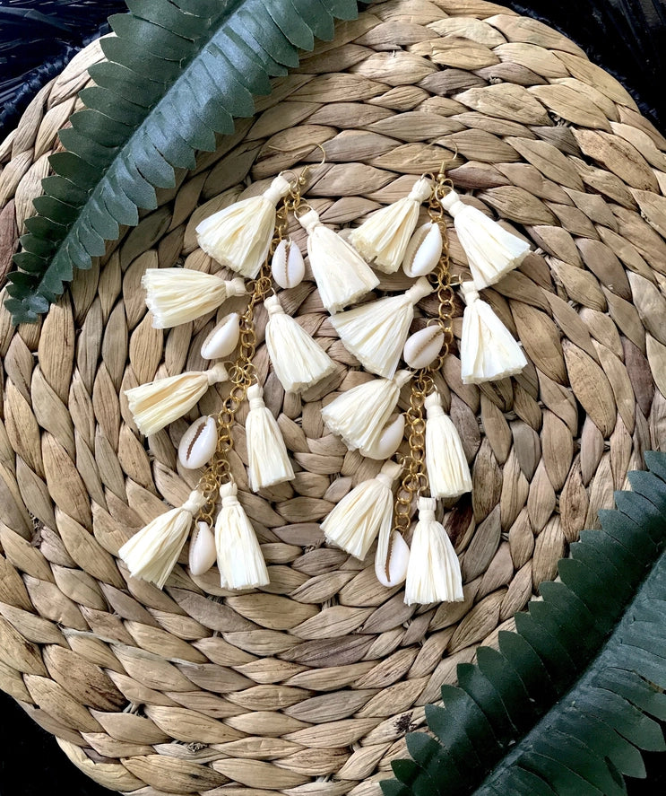 Rock the earthy cowrie shell trend with our natural color ivory raffia tassel earrings! 🐚 Effortlessly elegant, cowrie shells and raffia tassels are the ultimate beachy update for your statement earring game, and girl, these earrings got it all!🔥