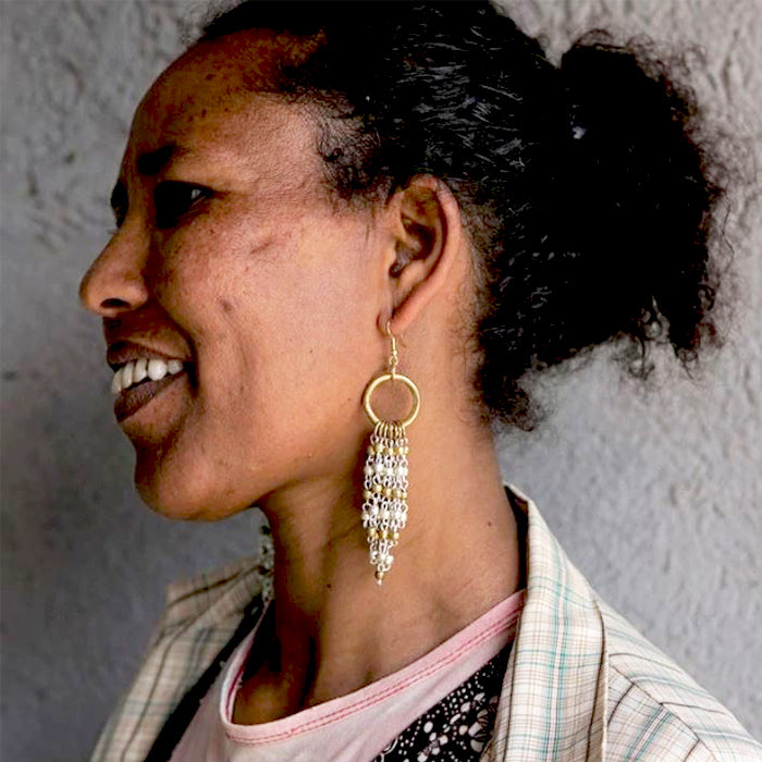 These unique recycled bullet casing earrings are handmade in Ethiopia, by women artisans who are paid a fair living wage and support an ethical livelihood and business.