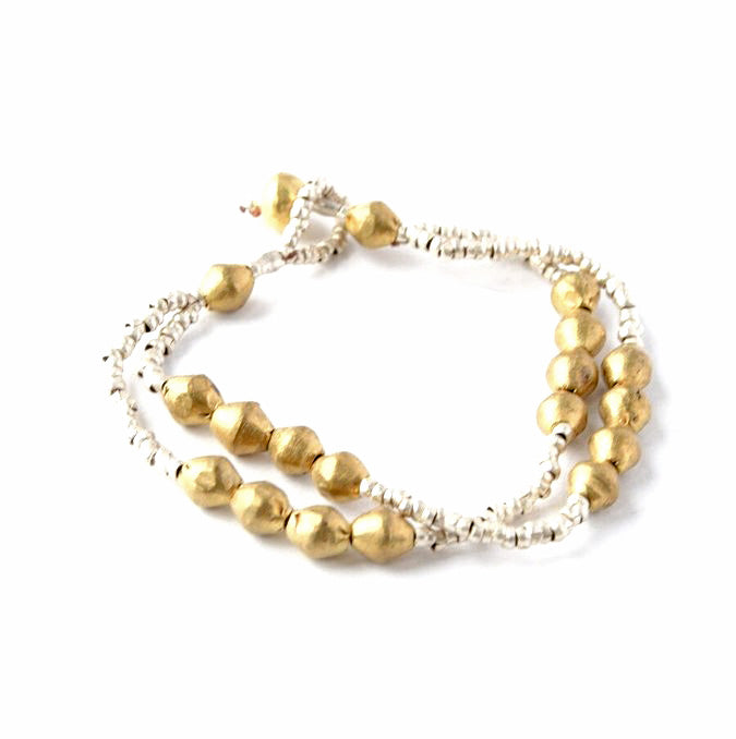 The two-toned Satellite Artillery bracelet is made by women in Ethiopia from recycled materials, specifically recycled bullet casings.