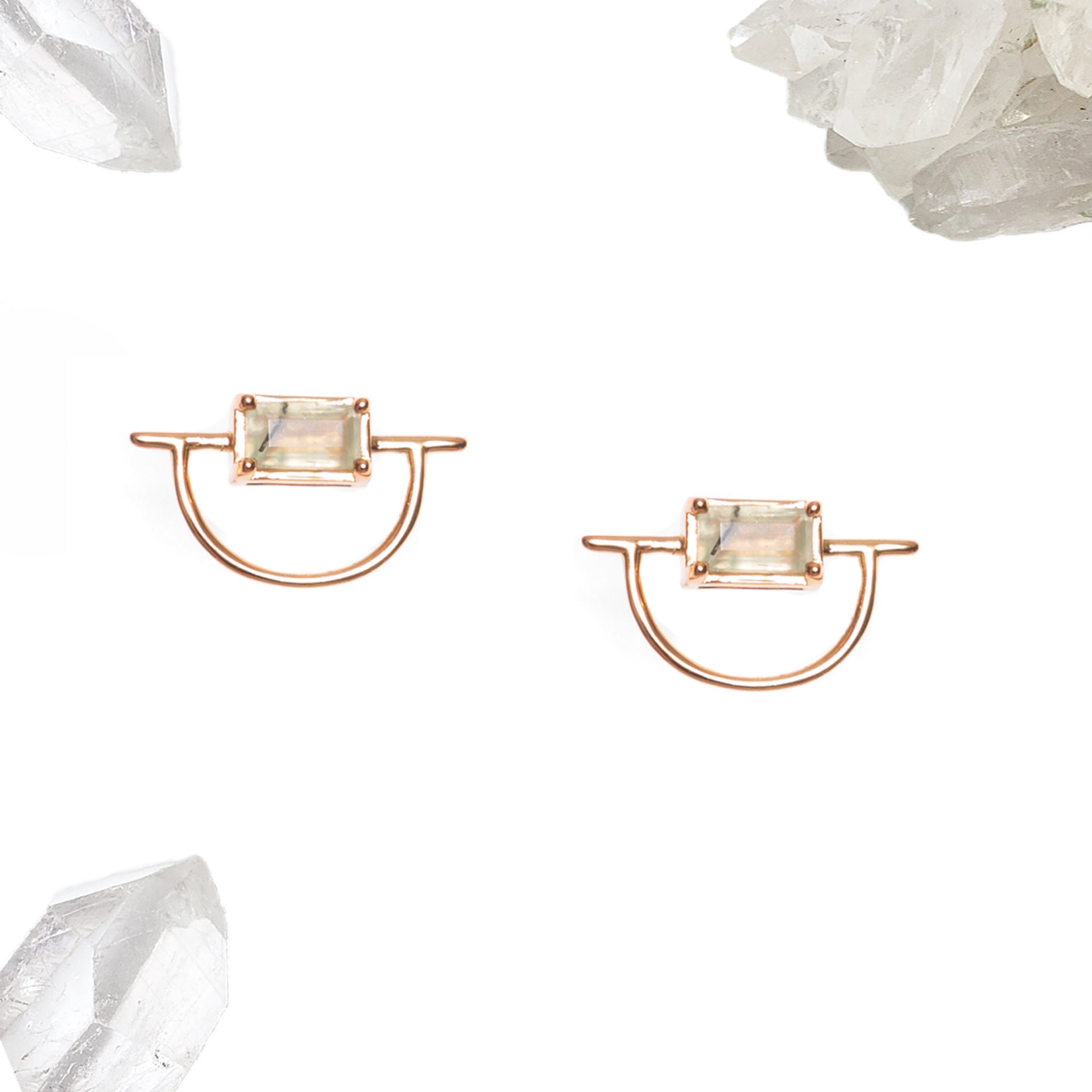 For a more modern, modest look, try these stunningly dainty handmade Horizon studs in Prehnite, Rose Quartz or Labradorite.