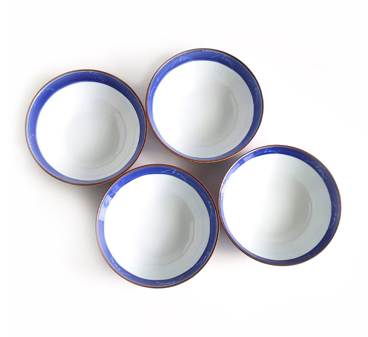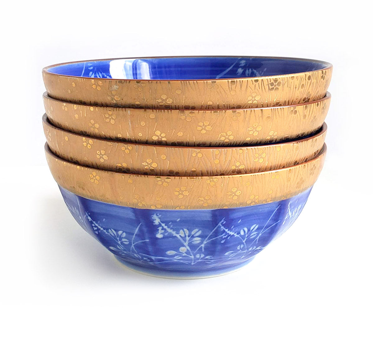 - Hand-painted with a cobalt blue-and-white, with gold rim