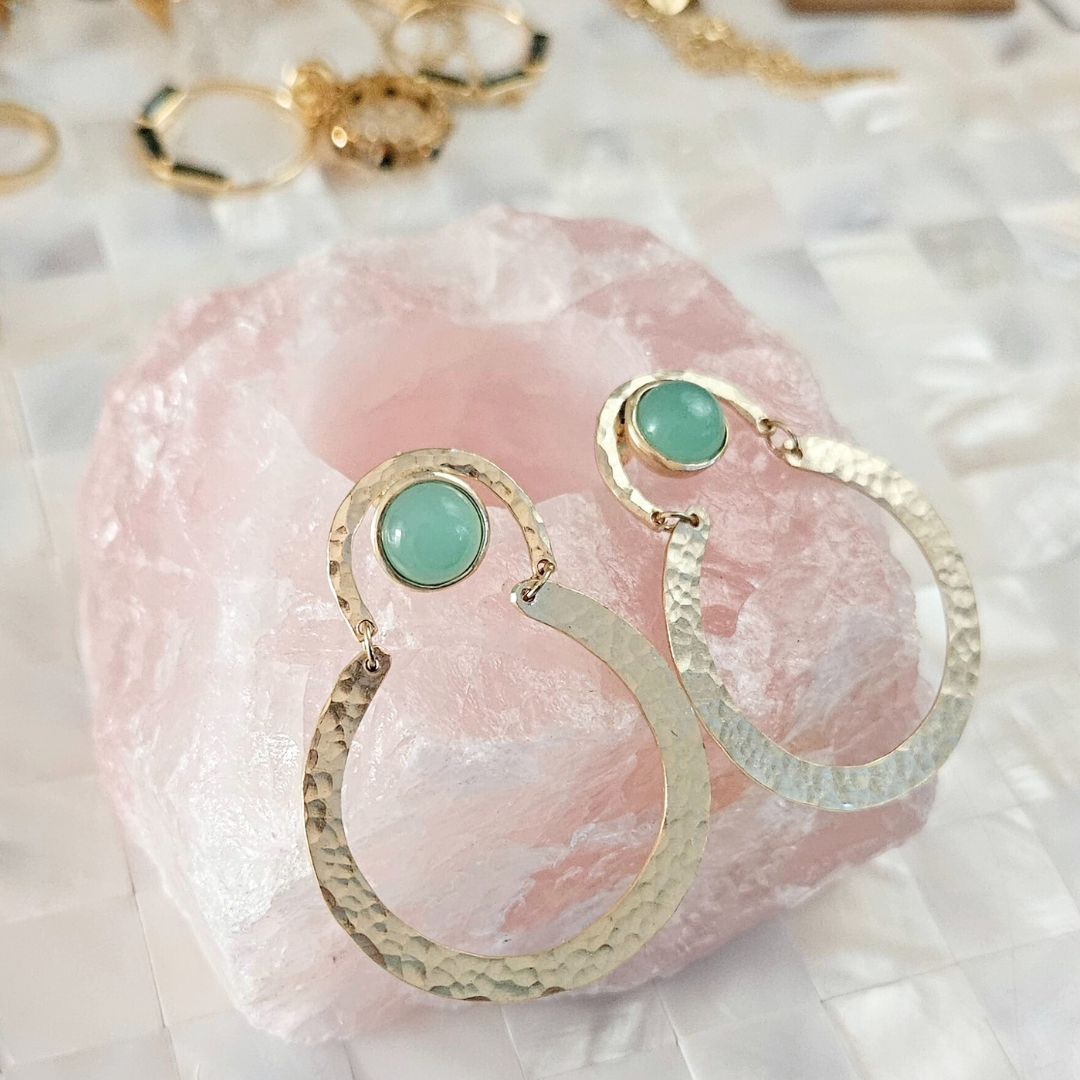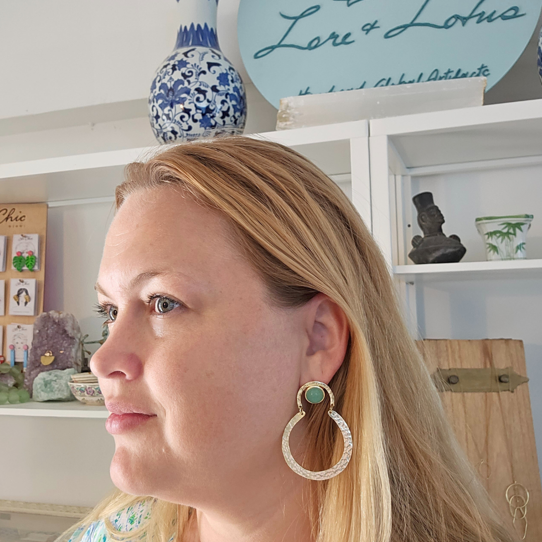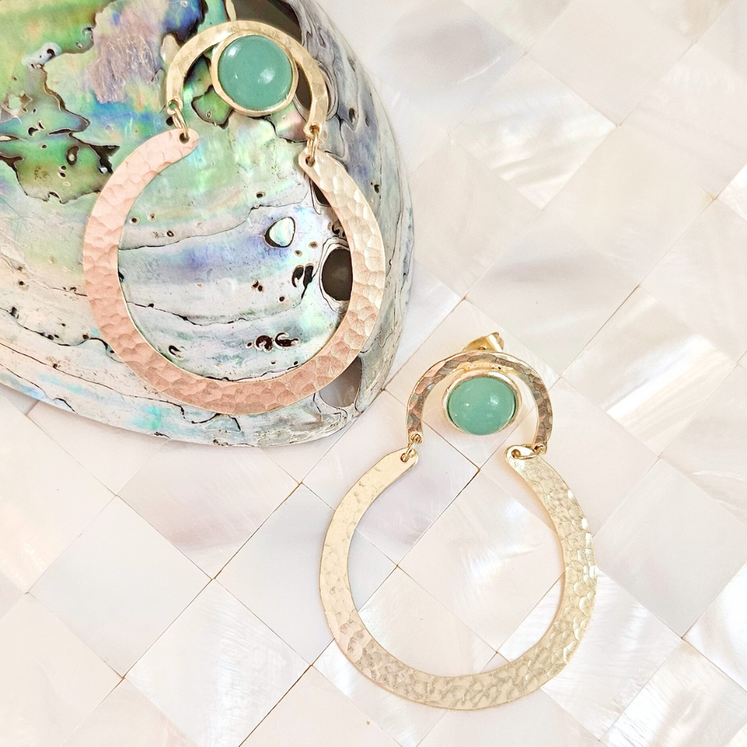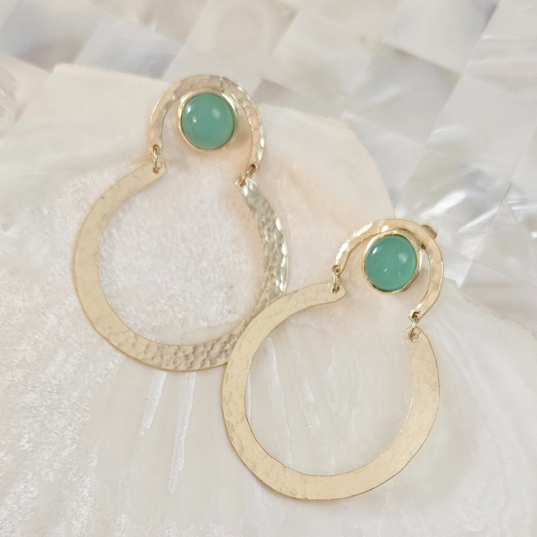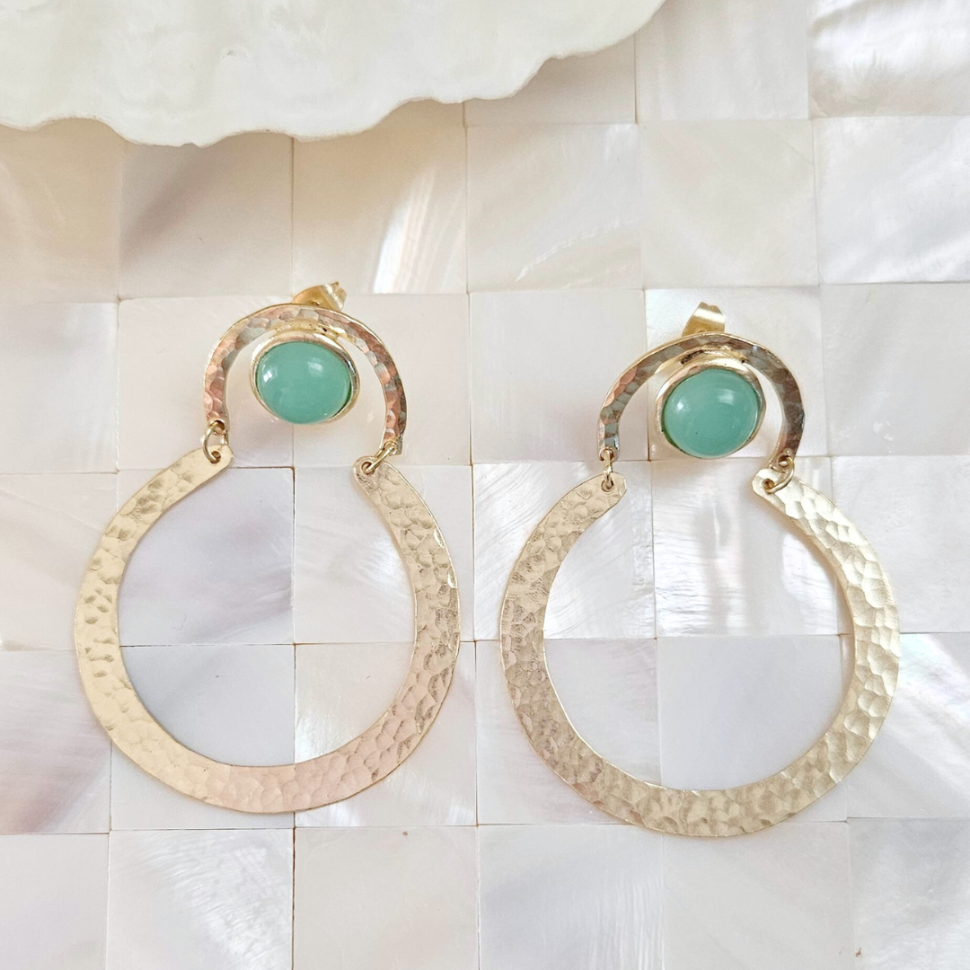 Enchanting and celestial, Helen is steeped in antiquity and emanates timeless charm with her soothing aqua stone, and shimmering hammered brass metal hoop design.