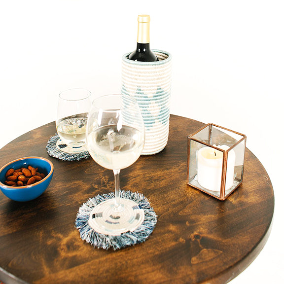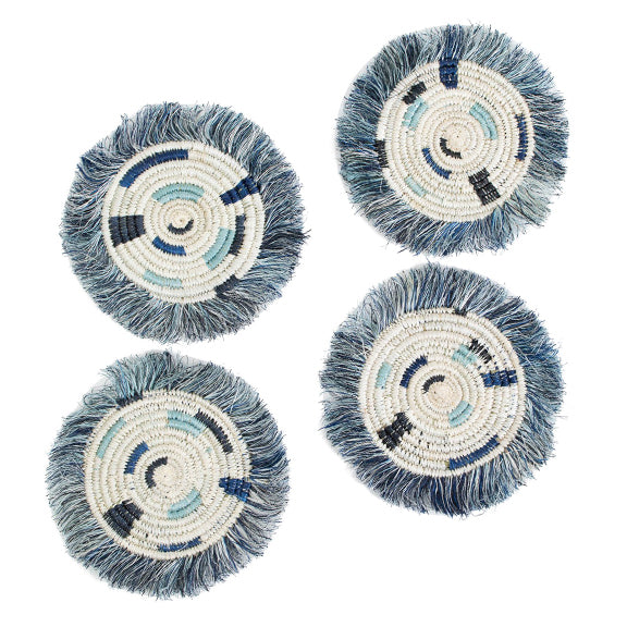 Intricately crafted and carefully silver-blue dyed sisal fiber and sweet grass makes this fringe coaster set unique. They can be used for your glass of wine in the evening, or on the living table when you are enjoying your early morning cup of coffee. They also make a wonderful gift for a housewarming or hostess.