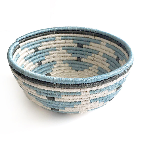 A stunning blue-gray-cream Catch All Bowl, perfect for displaying a variety of beautiful things! With it's rather large size, it's a wonderful bread basket (safe for food), for collecting gloves or keys at the door, or even displayed on a shelf with other decor or cherished books, for a global eclectic style.