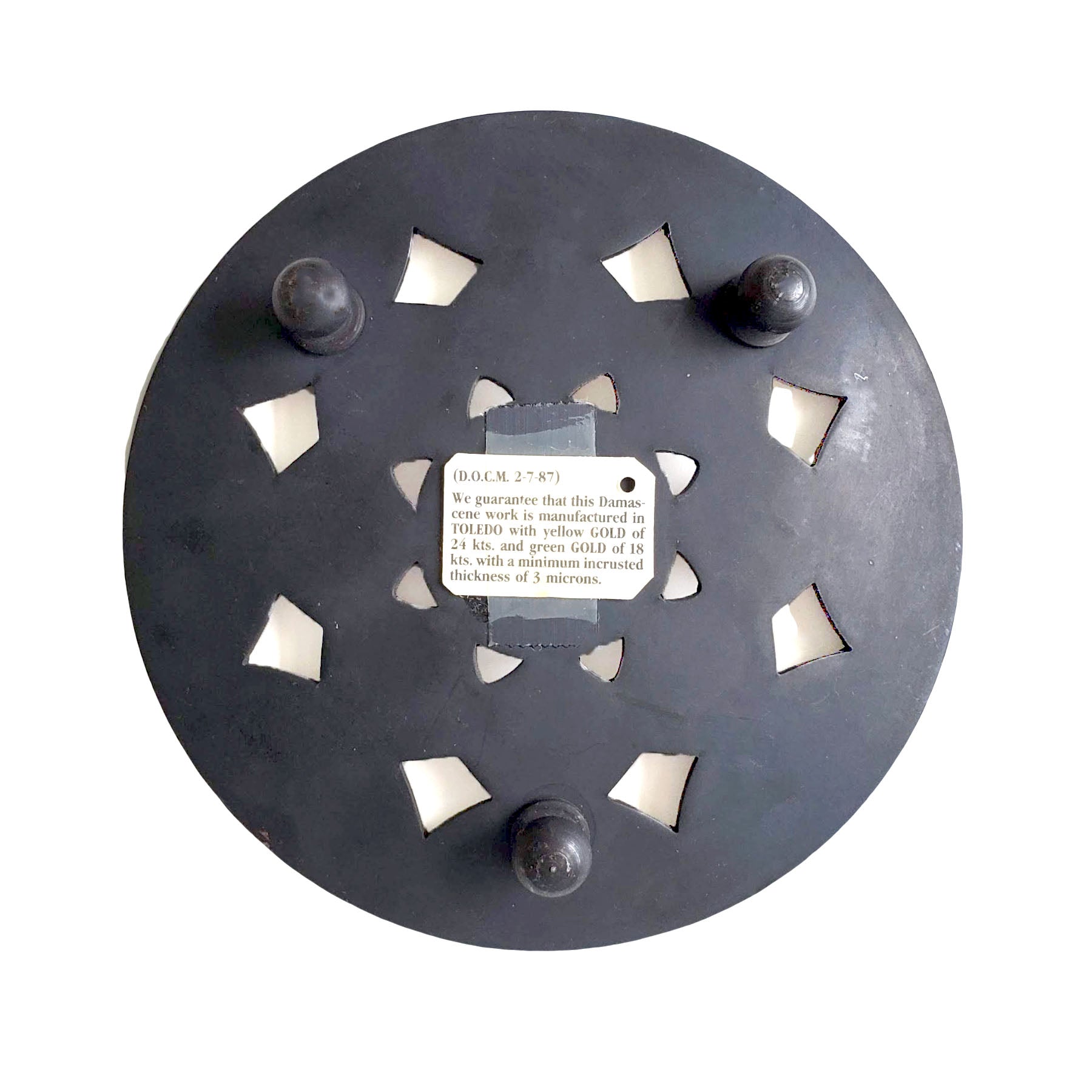Discover the brilliance of Damascus craftsmanship, 'damasquinados', or damascene handicrafts. Toledo, Spain is renowned for its Damascening, the Moorish art of inlaying gold or silver threads into black steel in a decorative pattern. The skill is used to decorate jewelry and plates, such as this stunning genuine gold inlaid mini plate that exudes elegance and refinement. Crafted with meticulous attention to detail, this exquisite plate showcases the unmatched artistry and heritage of Damascus artisans.
