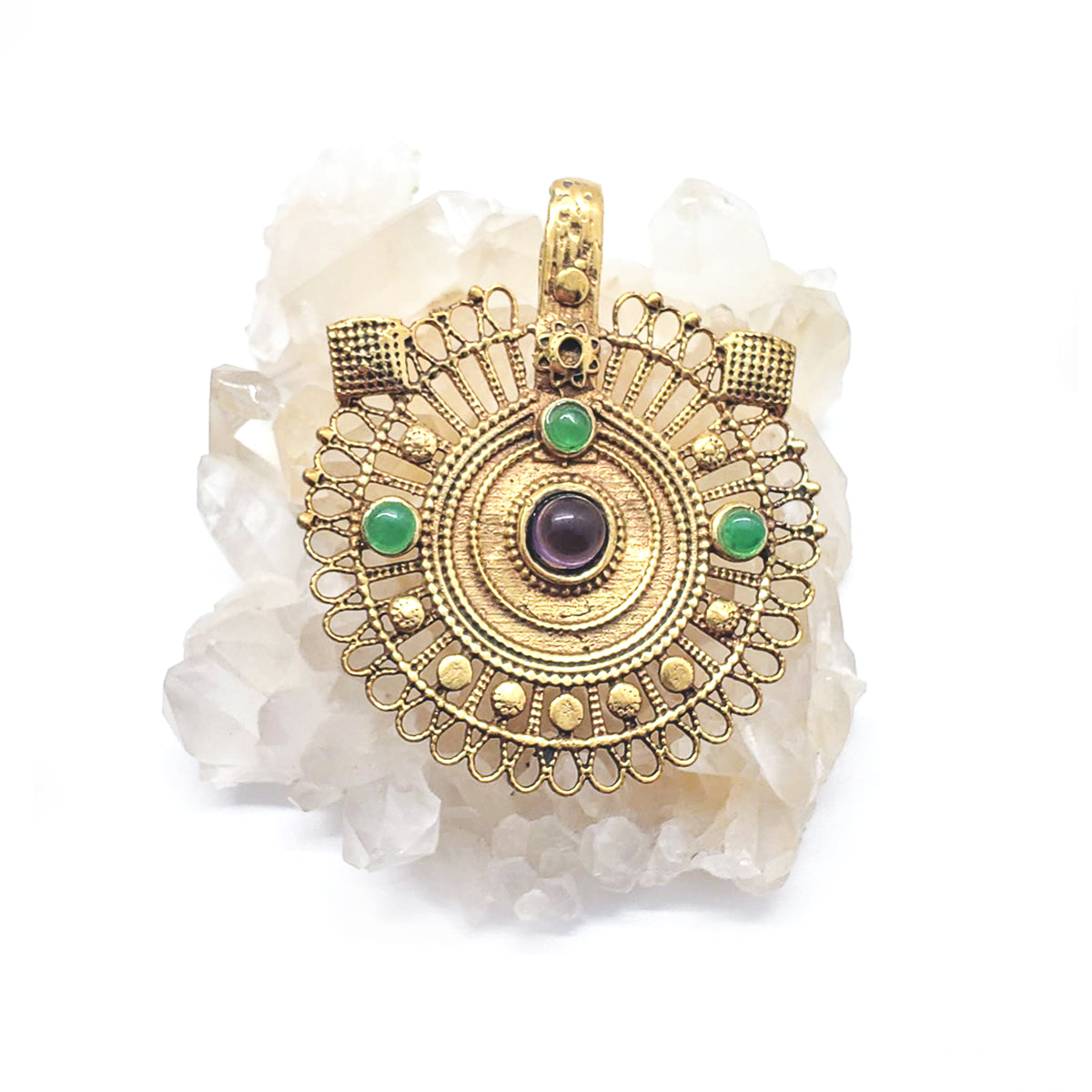 Recycled Brass Bejeweled Statement Pendant - Green Apatite & Amethyst Gemstone