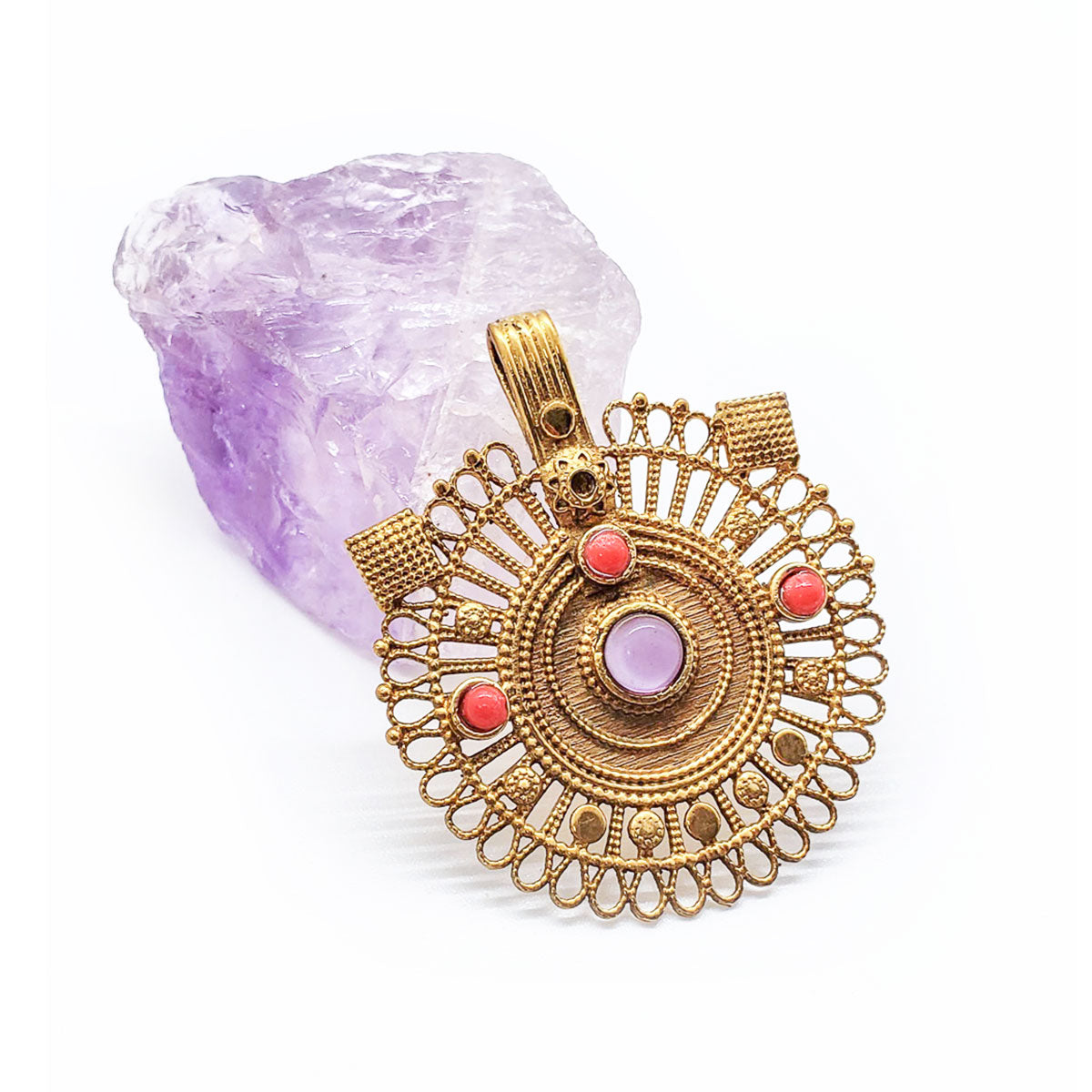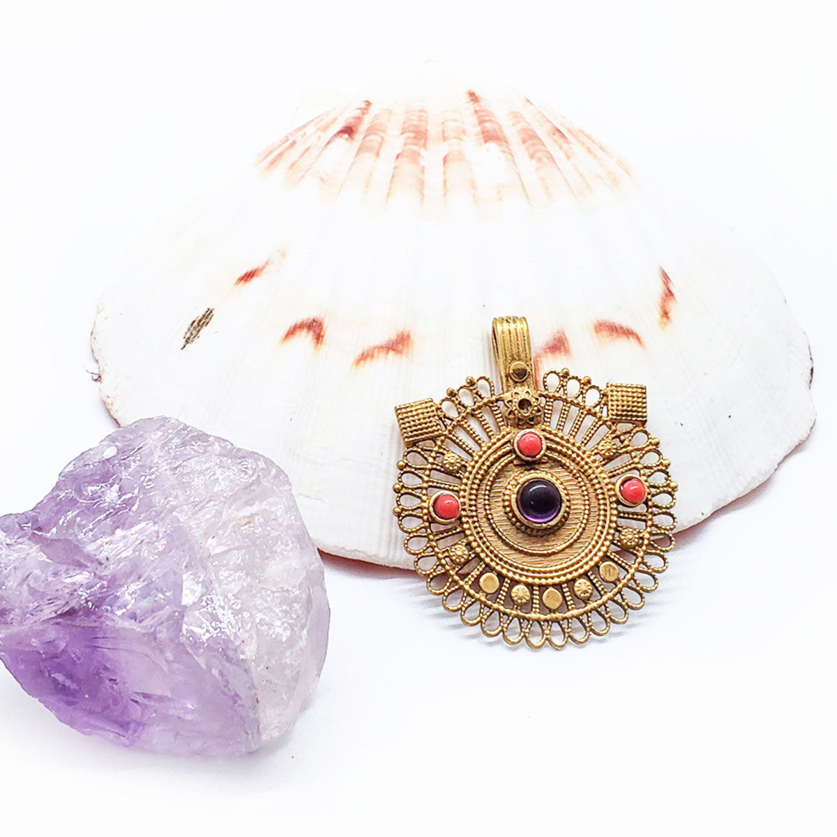 Recycled Brass Bejeweled Statement Pendant - Red Coral & Amethyst Gemstone
