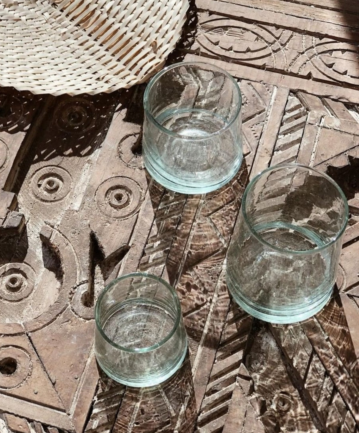 Following traditional methods, each piece in this collection is handblown (by mouth) in Marrakesh by local artisans using recycled glass found in the surrounding area.