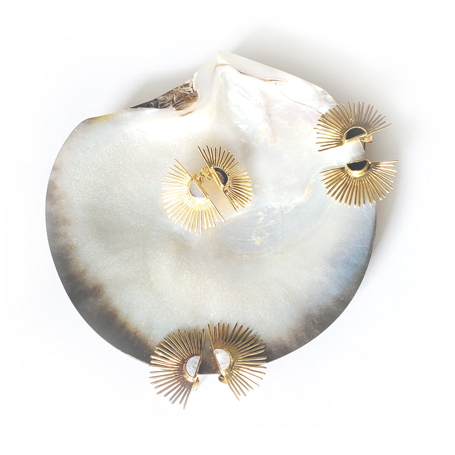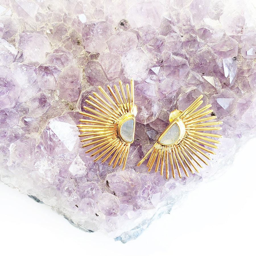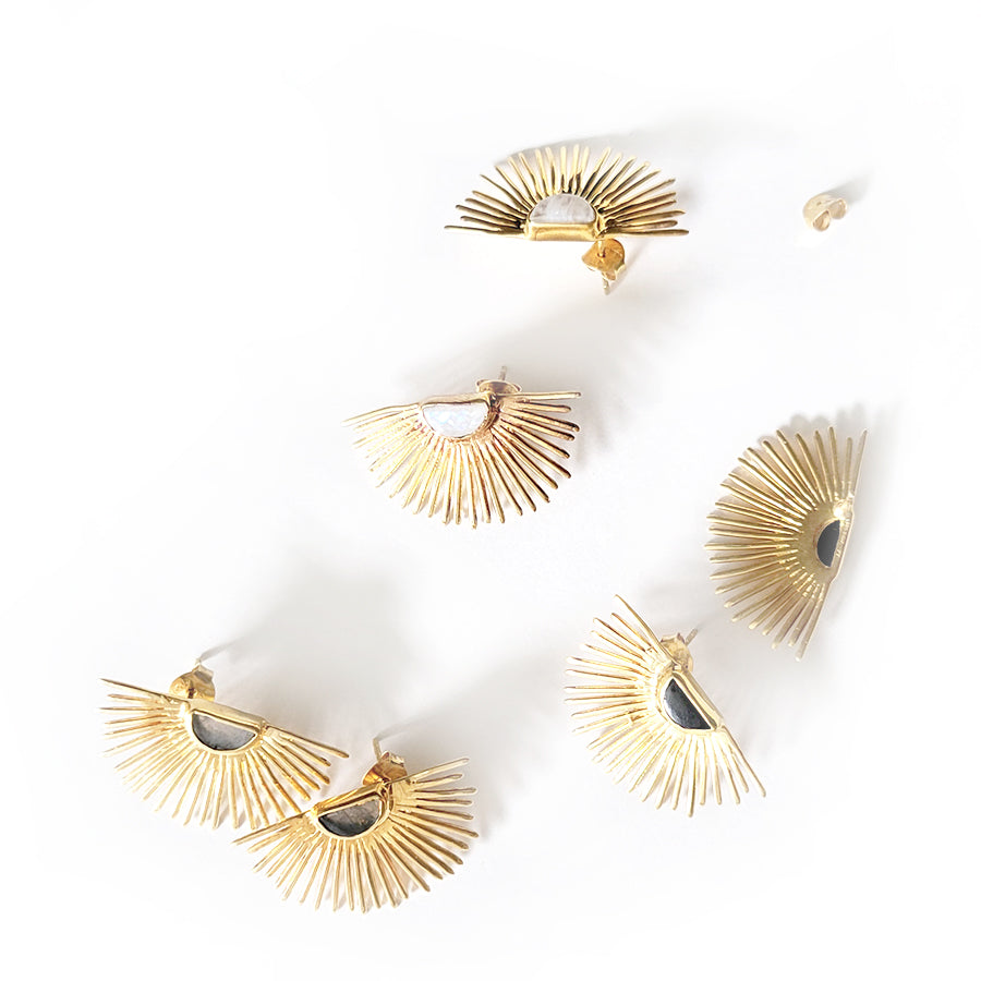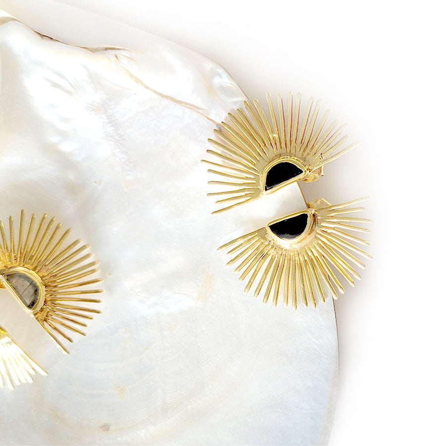 These stunning Starburst studs feature a gorgeous starburst pattern, accented with natural hand-cut half-moon gemstones.
