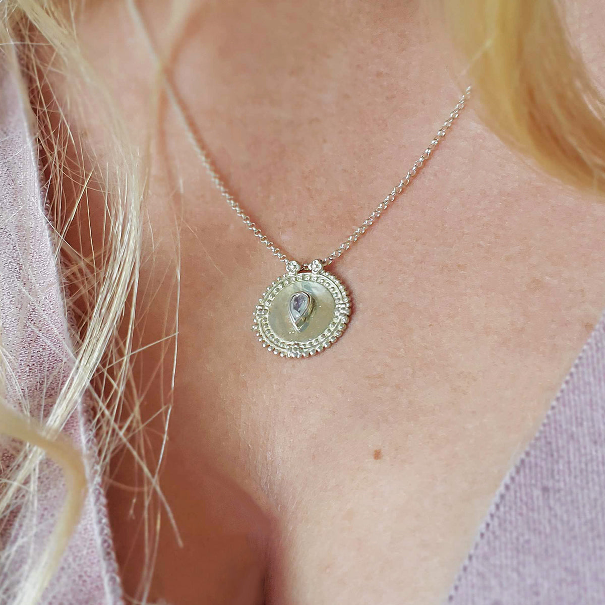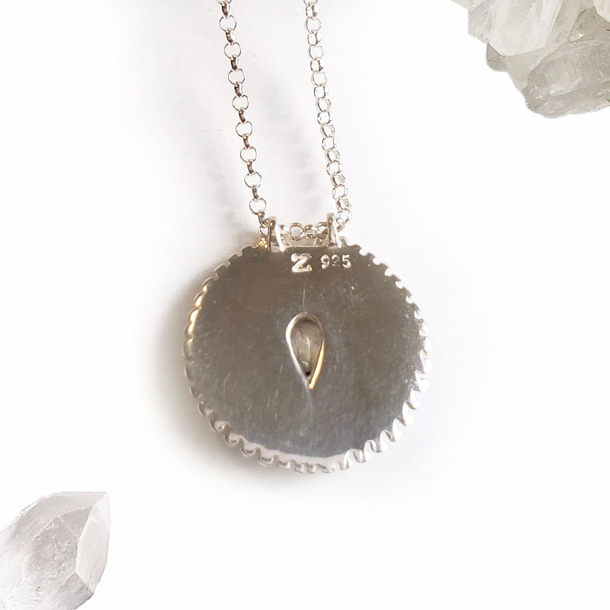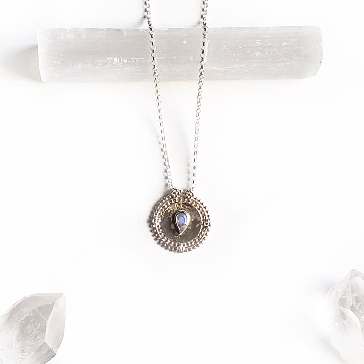 Handmade Recycled Sterling Silver featuring a faceted pear-shaped rainbow moonstone and unique dark oxidization. Each Cozumel necklace has a unique oxidization to it. Some are darker than others.
