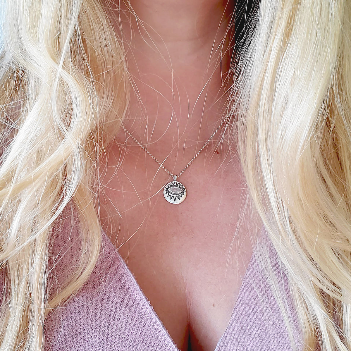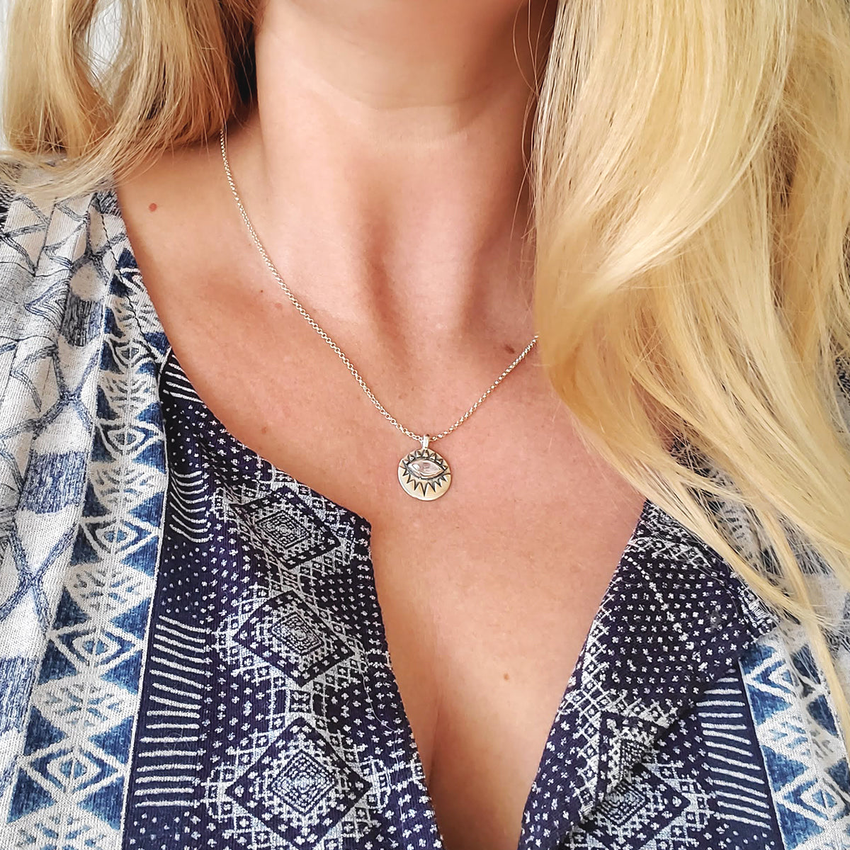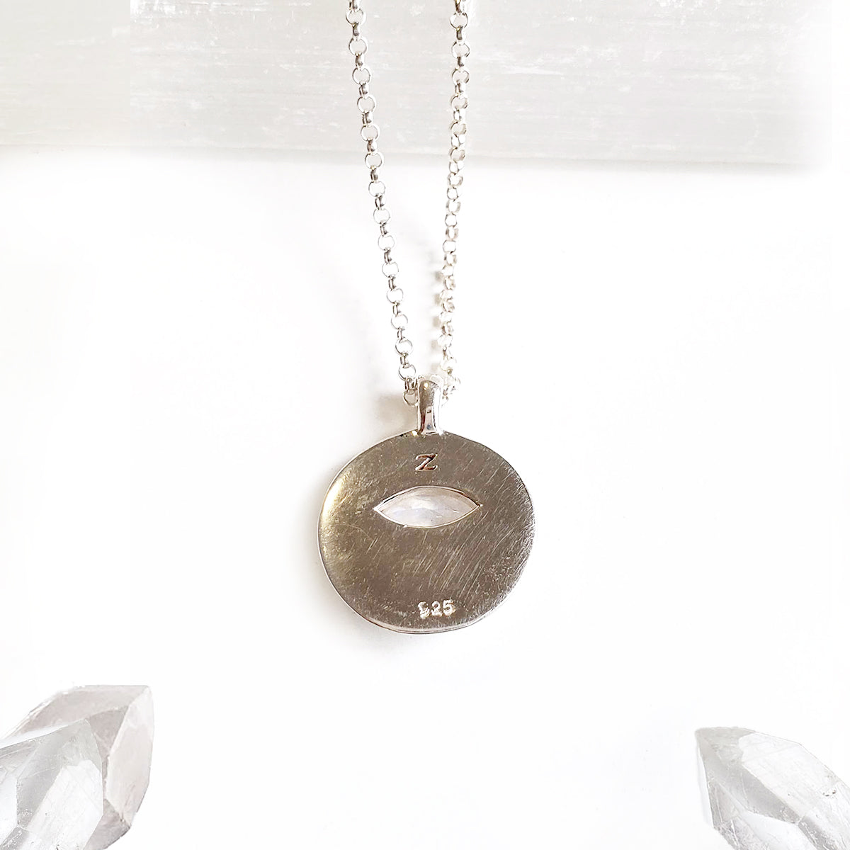 Handmade Recycled Sterling Silver Protection eye coin necklace with faceted marquise cut rainbow moonstone